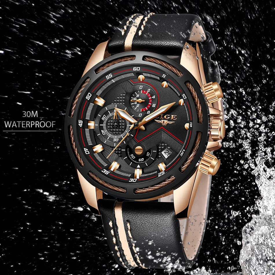 LIGE Watch Men Sport Quartz Clock Leather Mens Watches Top Brand Luxury Gold Waterproof Business Watch