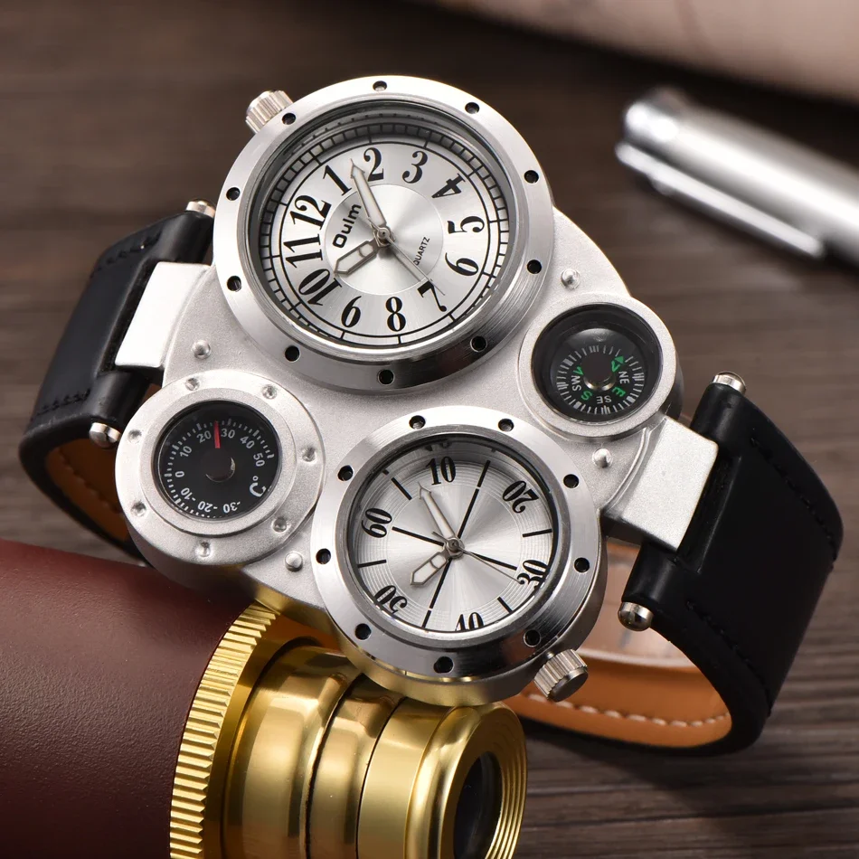 Men Chic Dual Movement Quartz Sport Watch Creative Dials Digital Bracelet Watches Waterproof Outdoor Thermometer Compass Clock