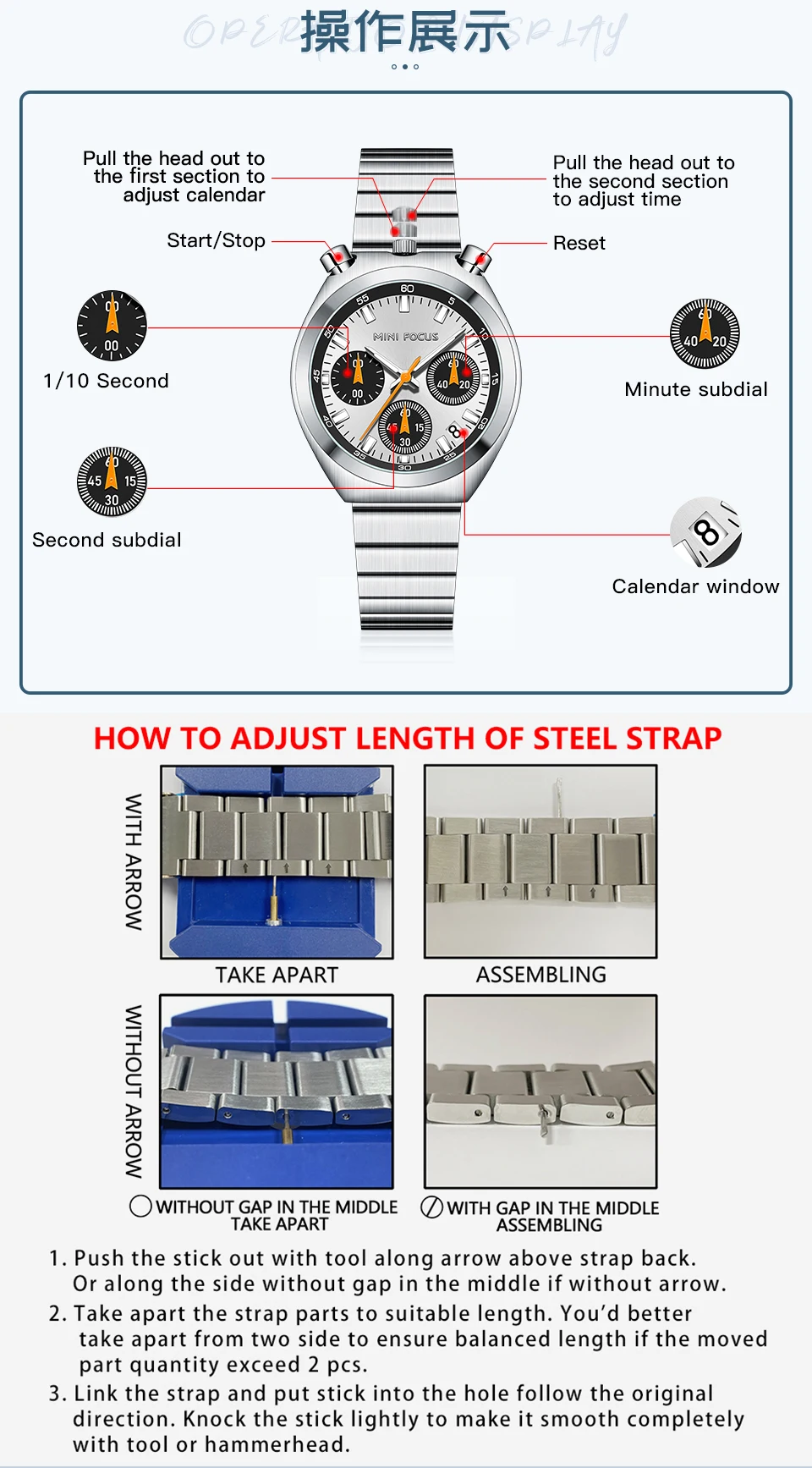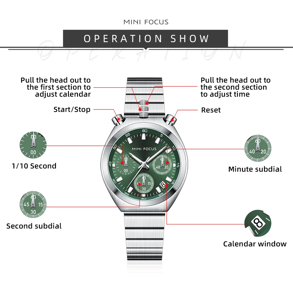 Function: 1/10 Second Sub-Dials; Second/Minute Sub-Dials;Calendar