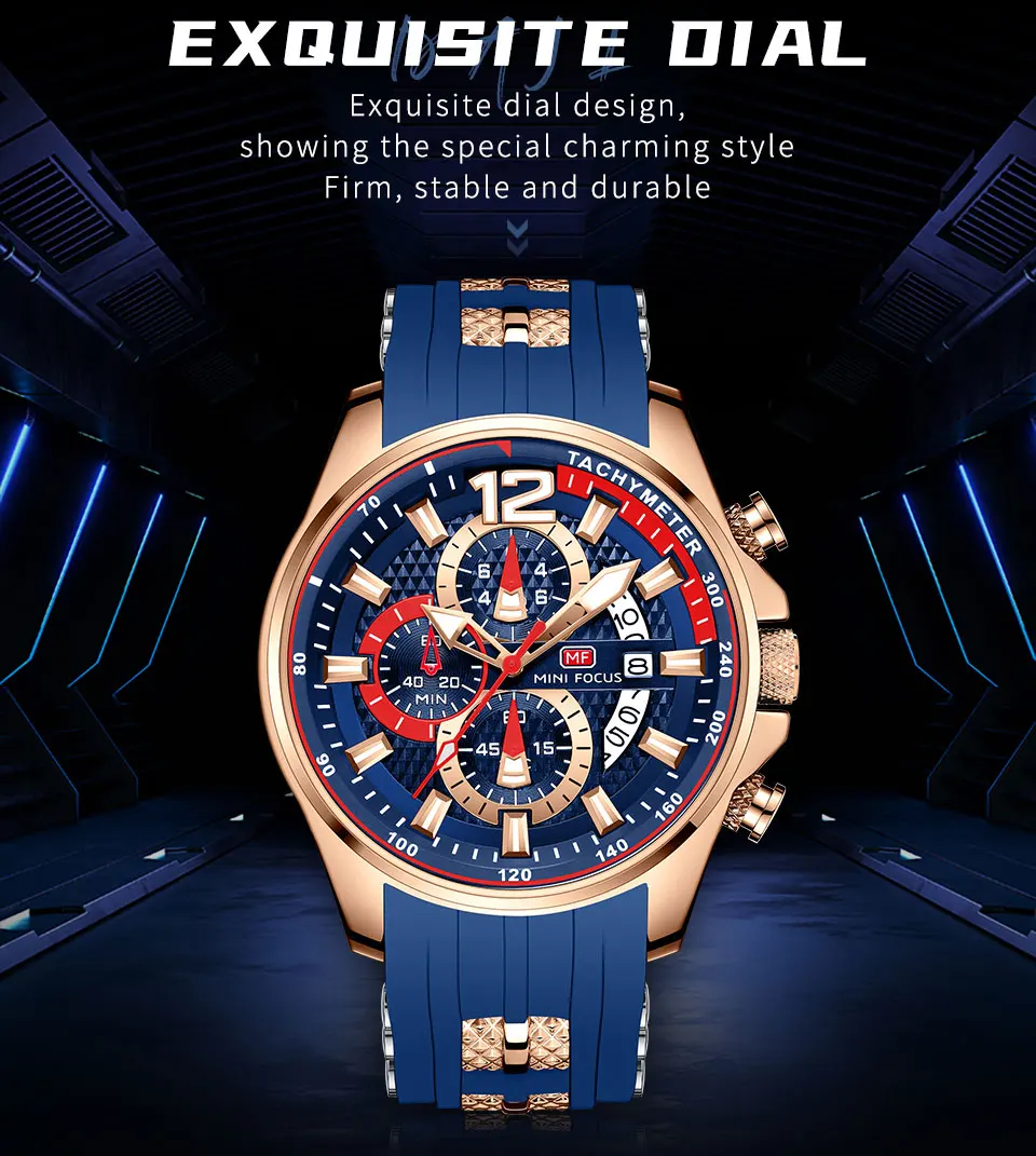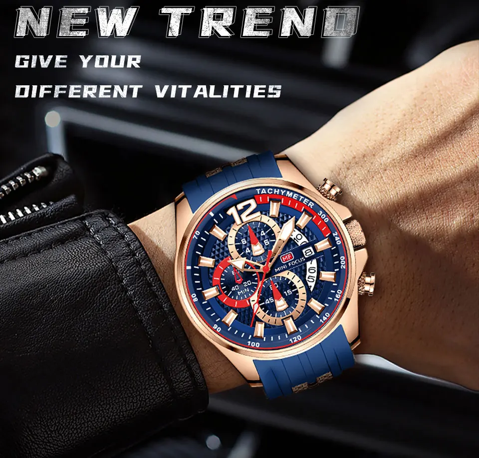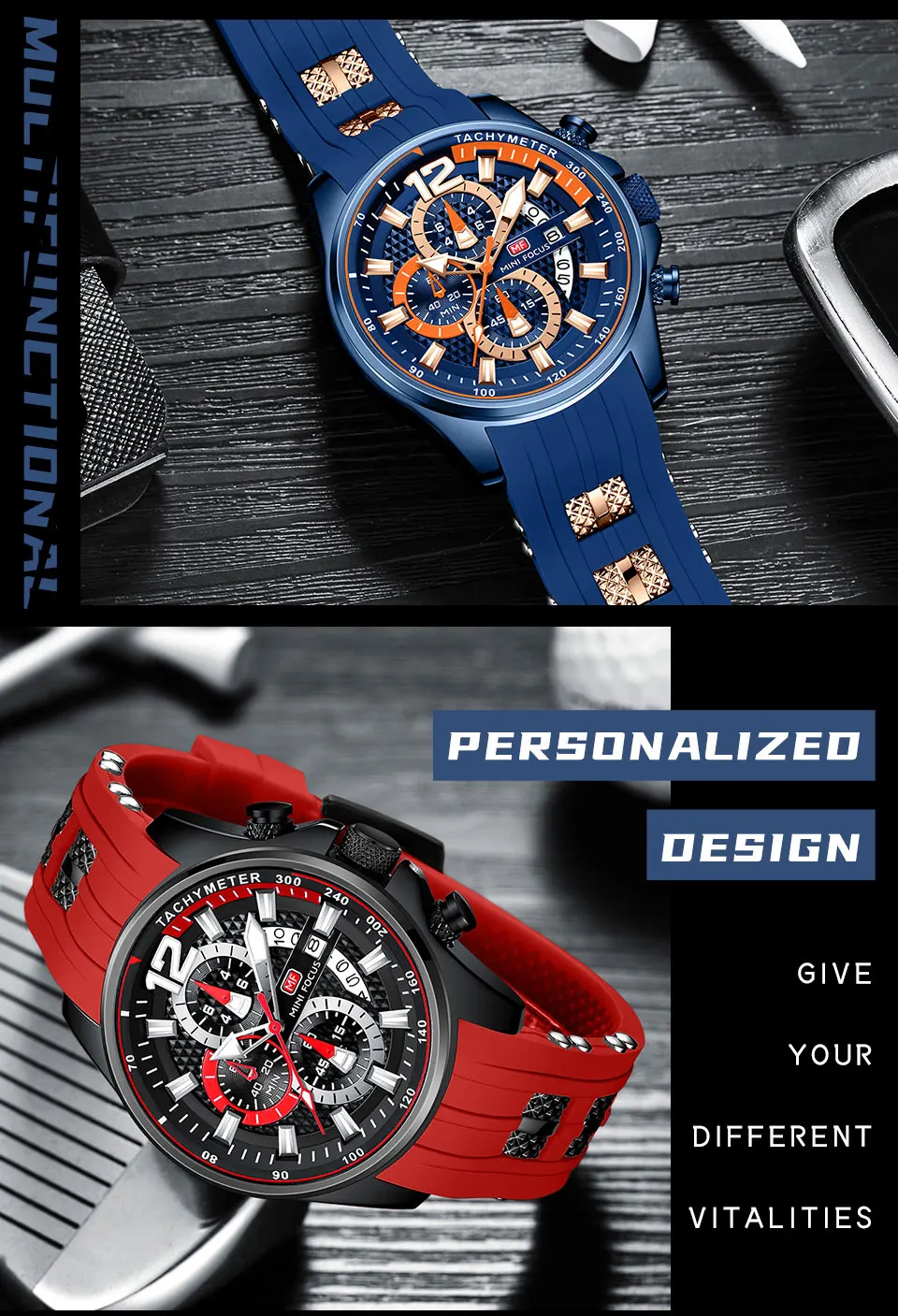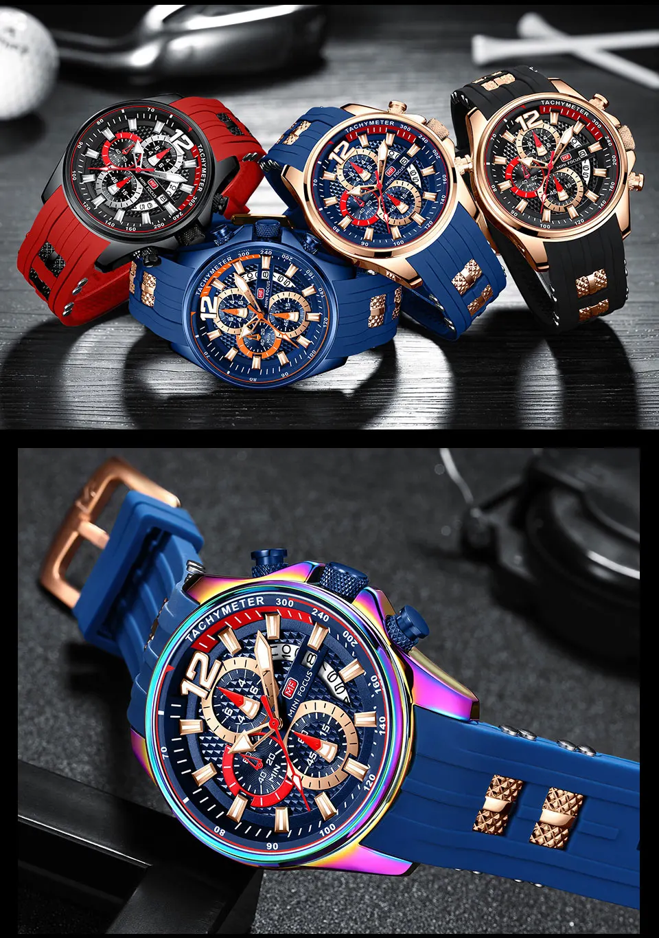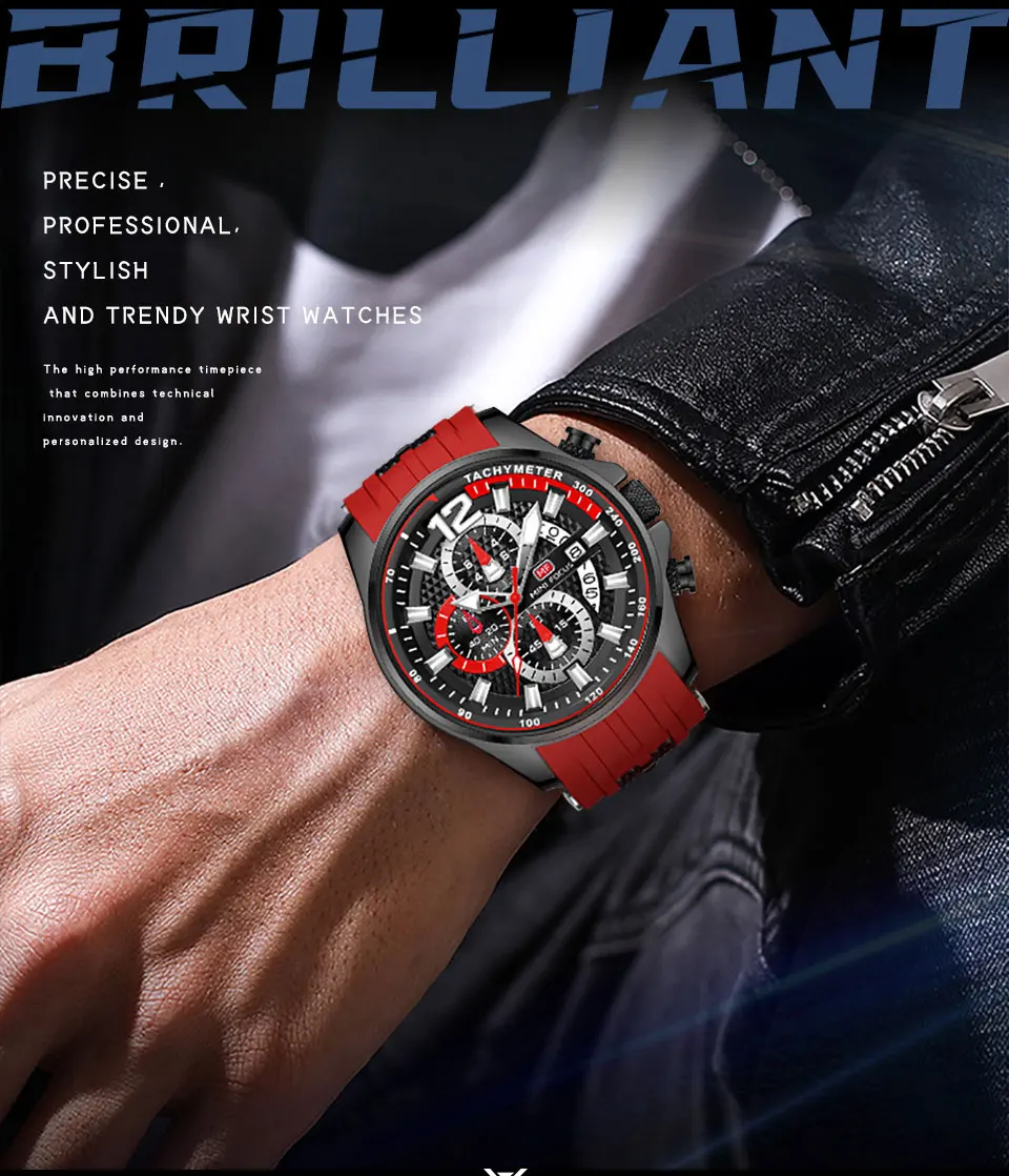 MINI FOCUS Red Watch for Men Fashion Luxury Chronograph Quartz Wristwatch with Silicone Band Luminous Hands Date Waterproof 0350
