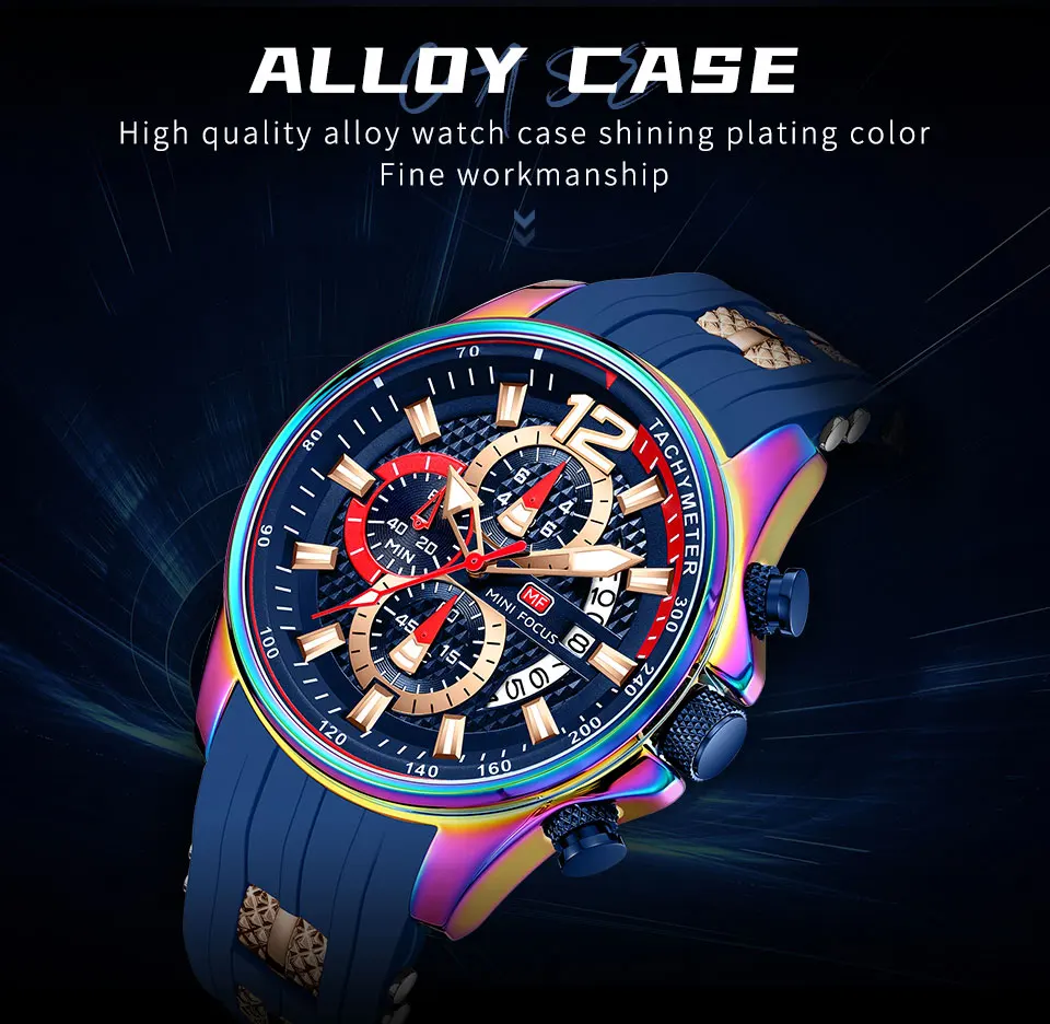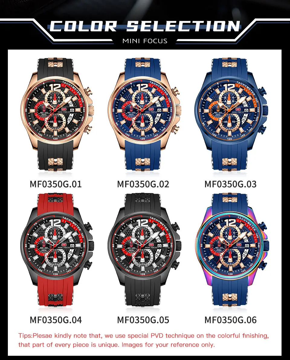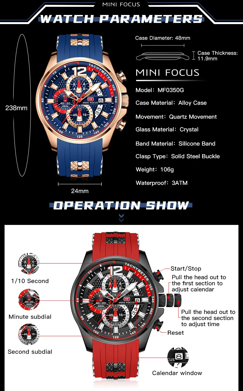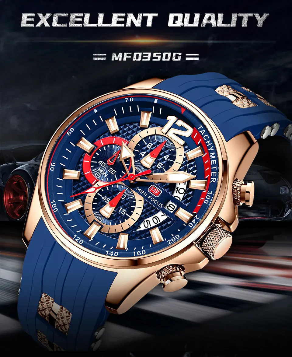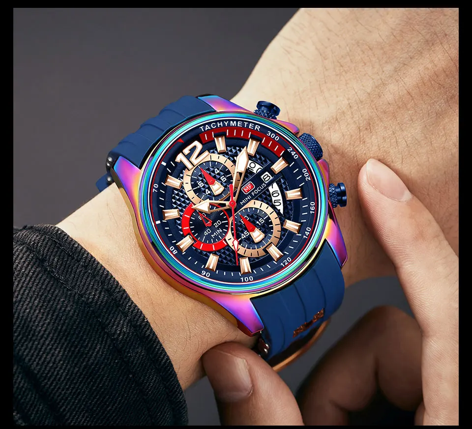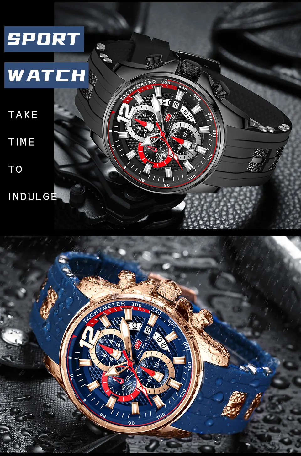 MINI FOCUS Red Watch for Men Fashion Luxury Chronograph Quartz Wristwatch with Silicone Band Luminous Hands Date Waterproof 0350