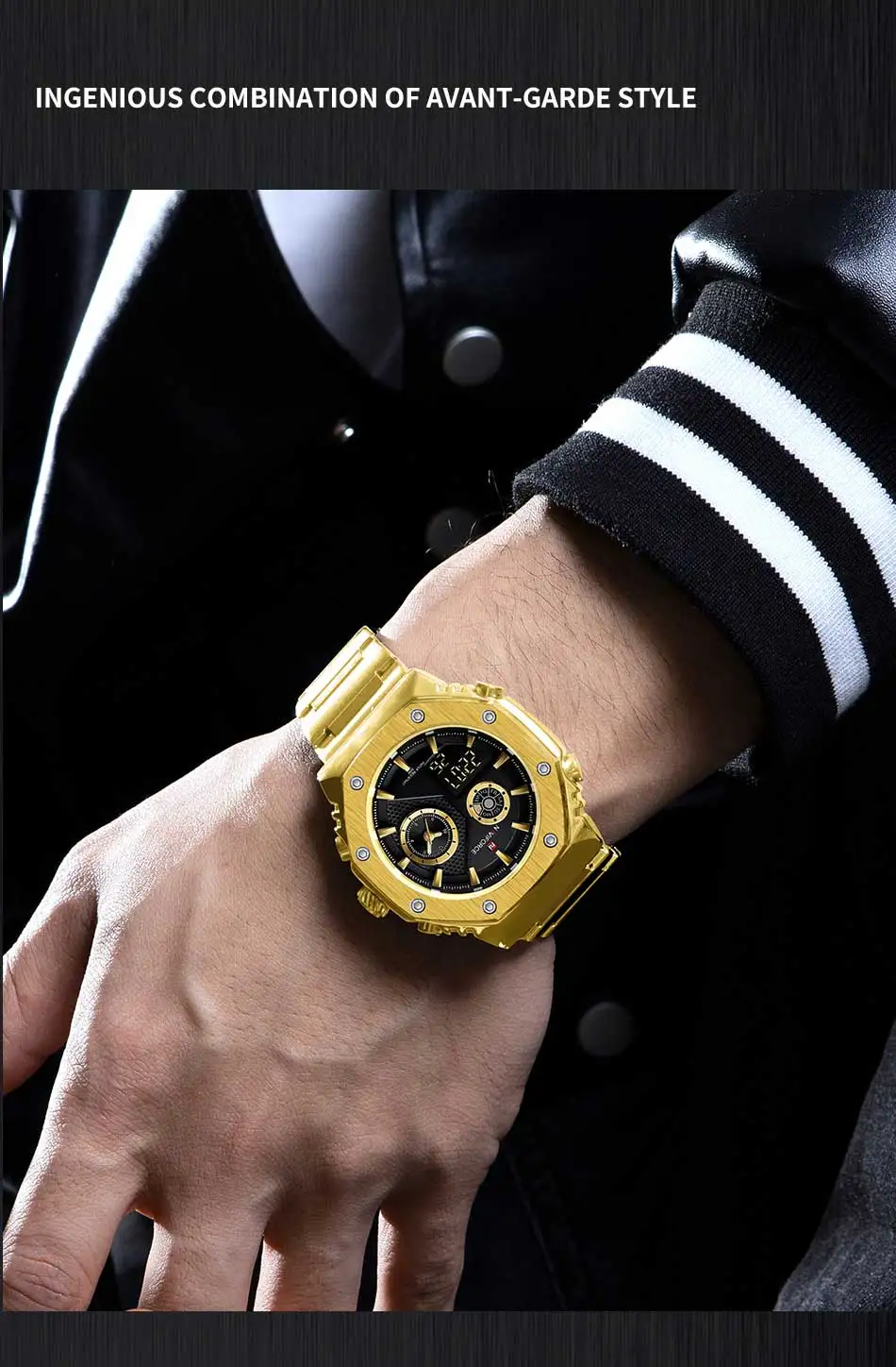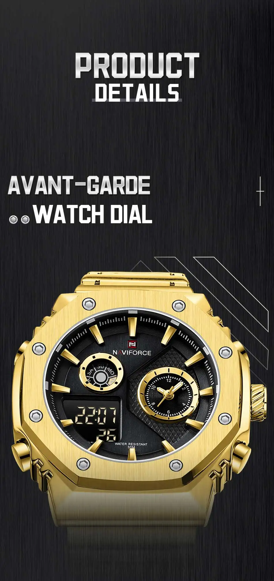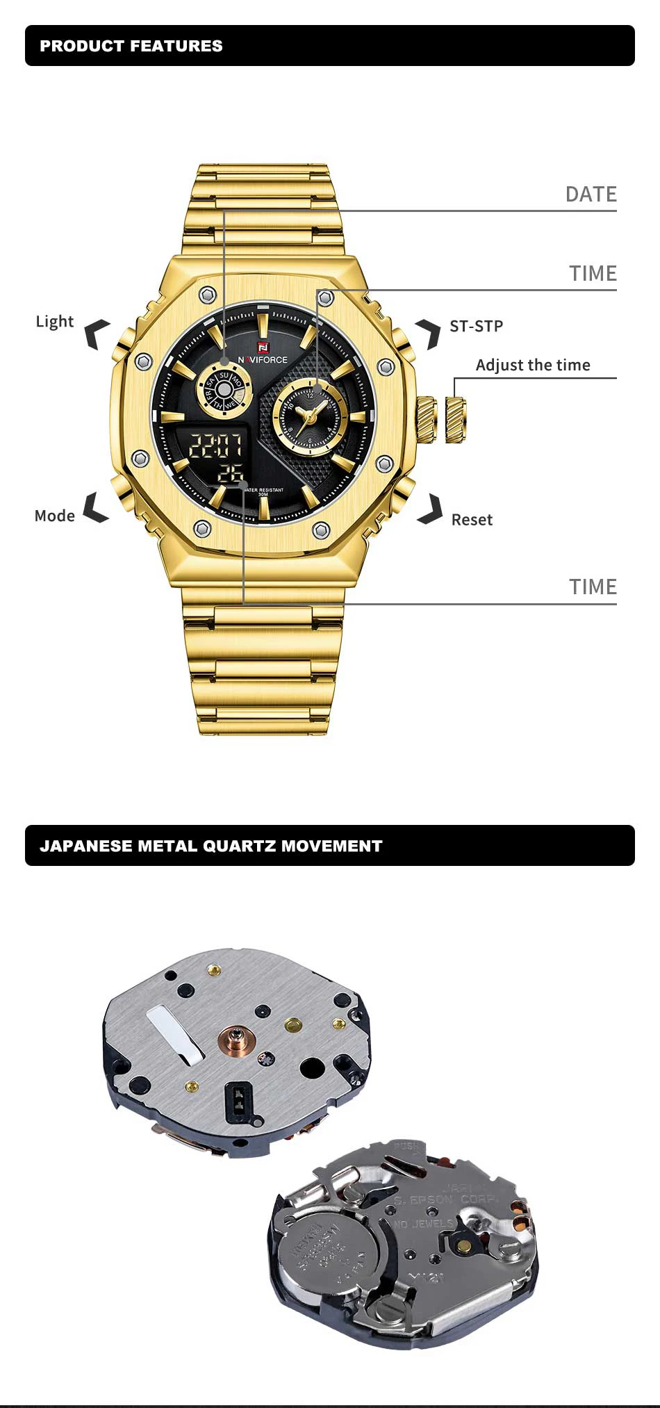 NAVIFORCE Men's Sport Watch Stainless Steel Strap Waterproof Quartz Wristwatch Male LCD Display Durable Clock Relogio Masculino