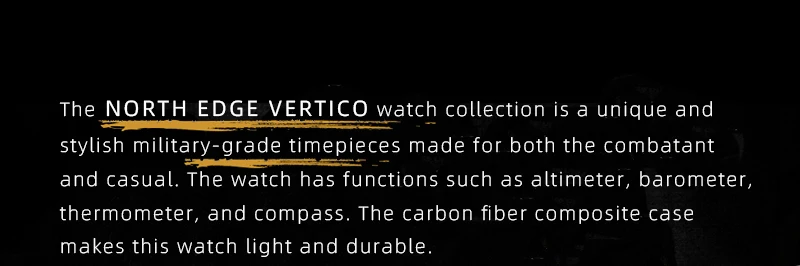 The_NORTH EDGE VERTICO watch collection is a unique and stylish military-grade timepieces made for both the combatant and casual. The watch has functions such as altimeter, barometer, thermometer, and compass. The carbon fiber composite case makes this watch light and durable.