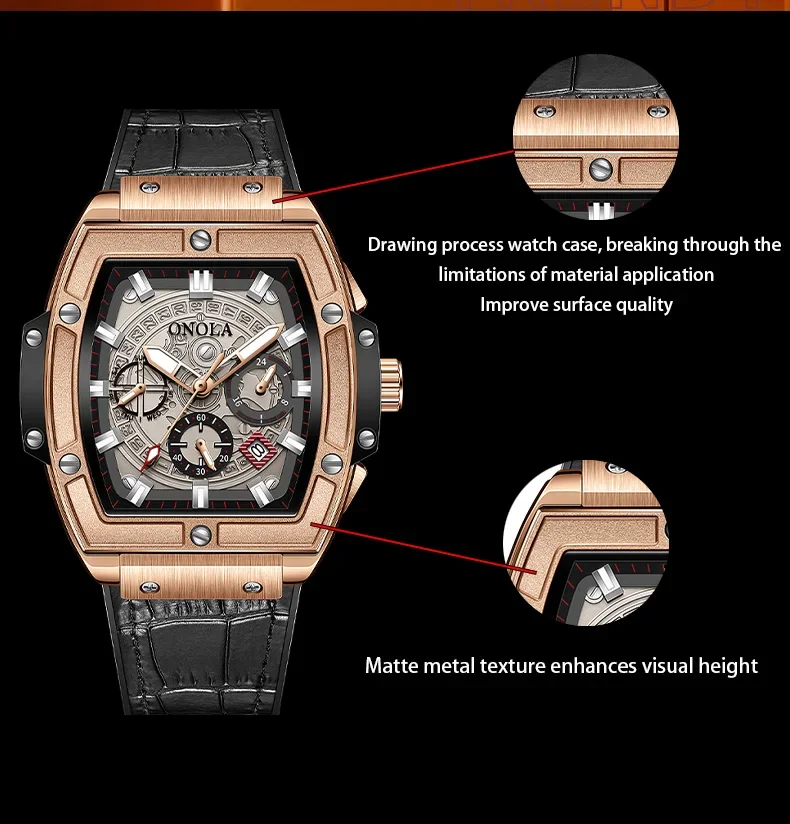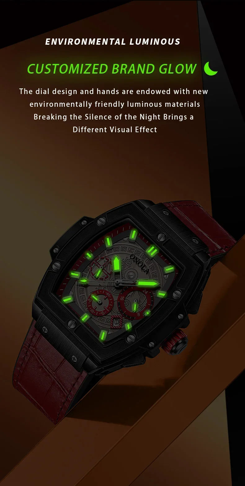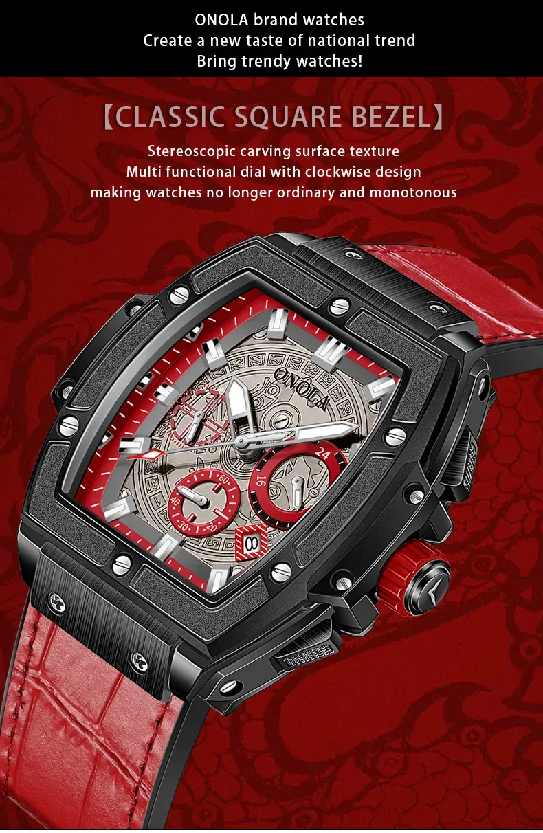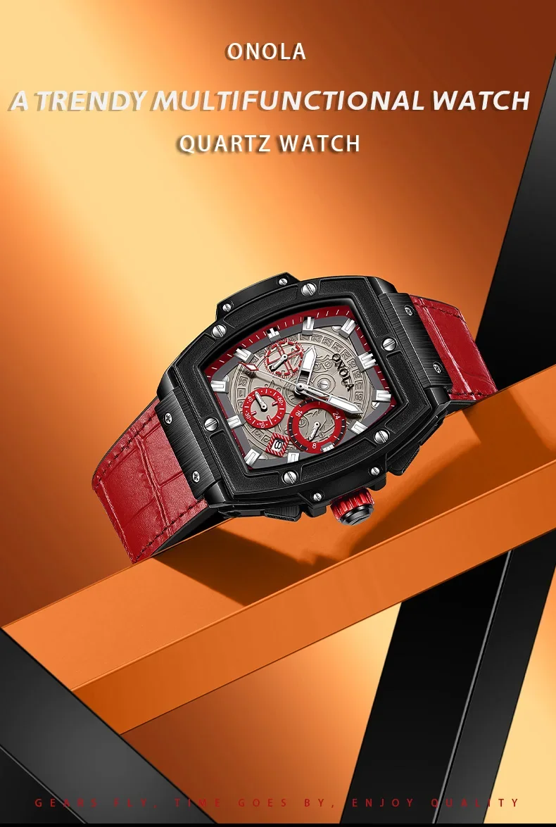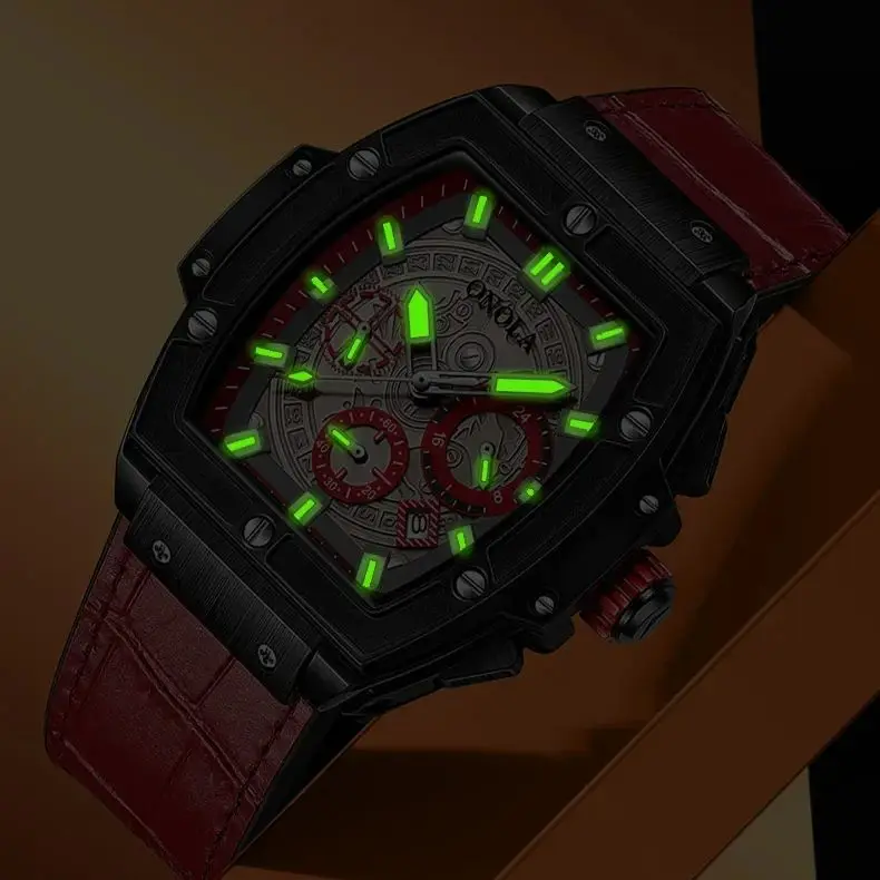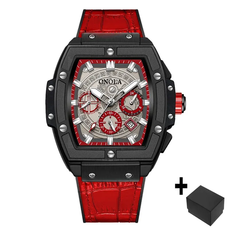 Onola casual red watch for men Sports multifunctional quartz clock fashion leather strap tonneau AAA wristwatch boy Reloj Hombre