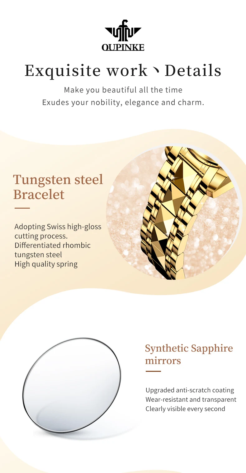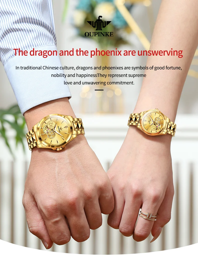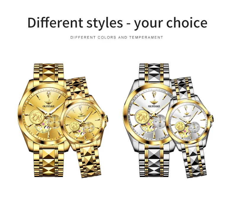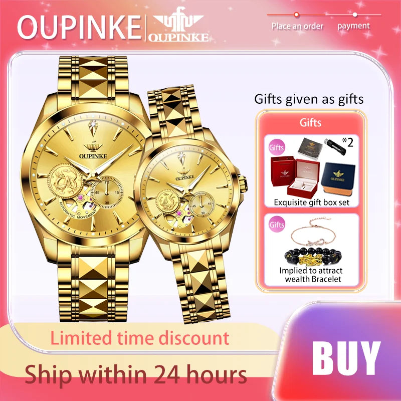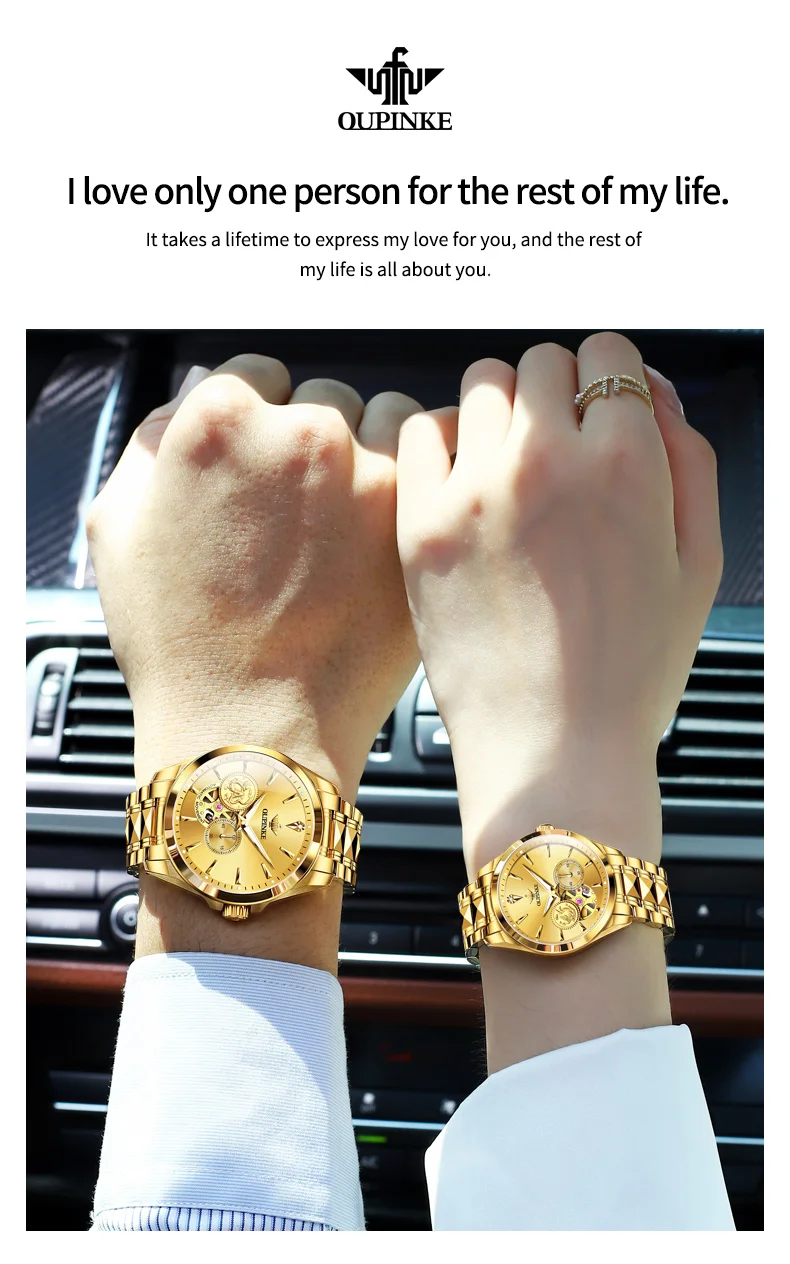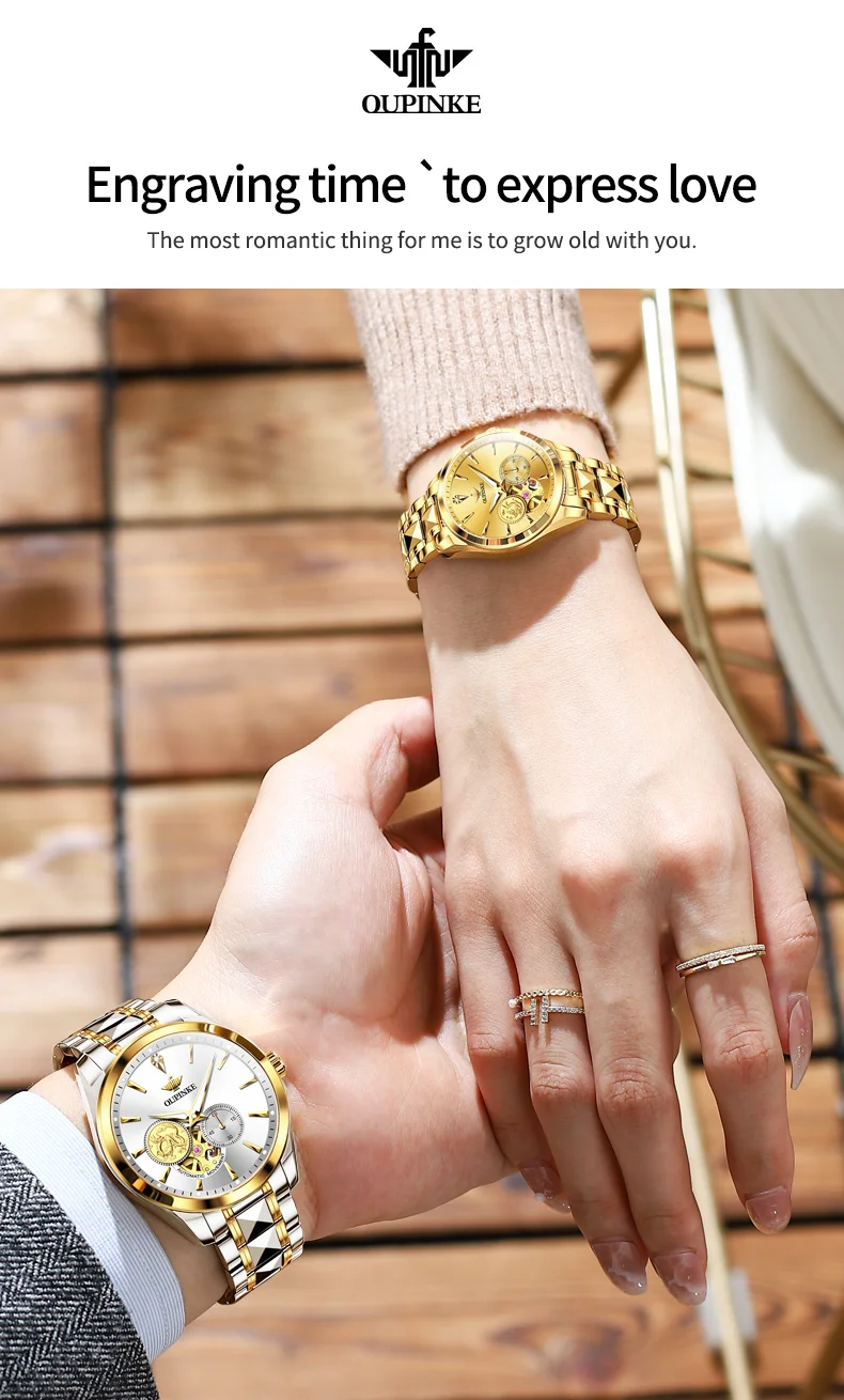 OUPINKE High Quality Couple Watch Tungsten Steel Strip True Gold Relief Dial Fully Automatic Mechanical Watch for Man and Women