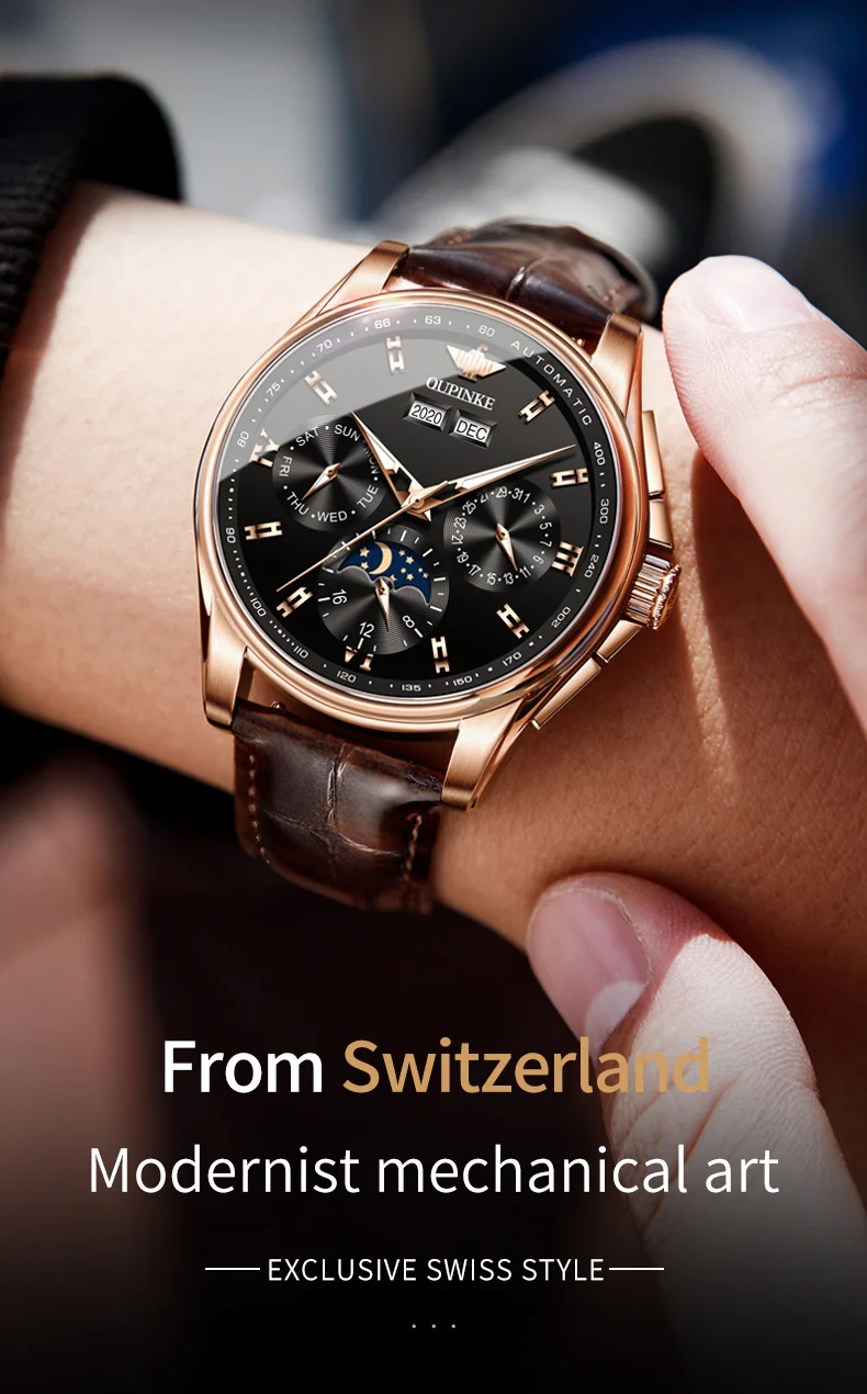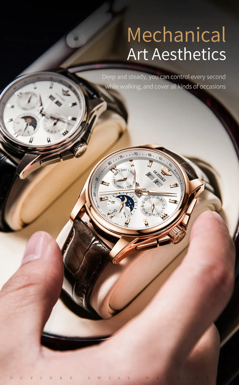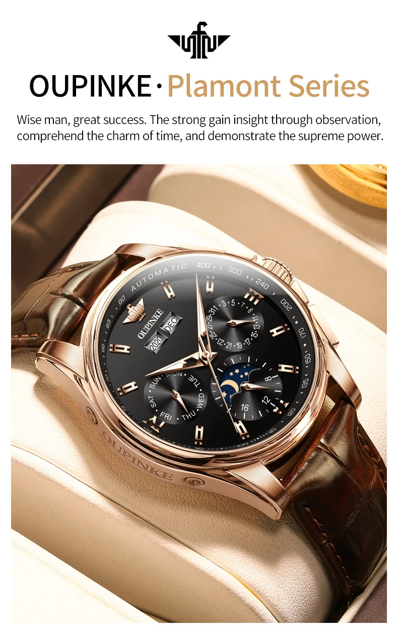 Top Brand OUPINKE Luxury Mechanical Watch Men Automatic Brown Leather Casual Waterproof Sport Moon Phase Wristwatch Reloj Hombre