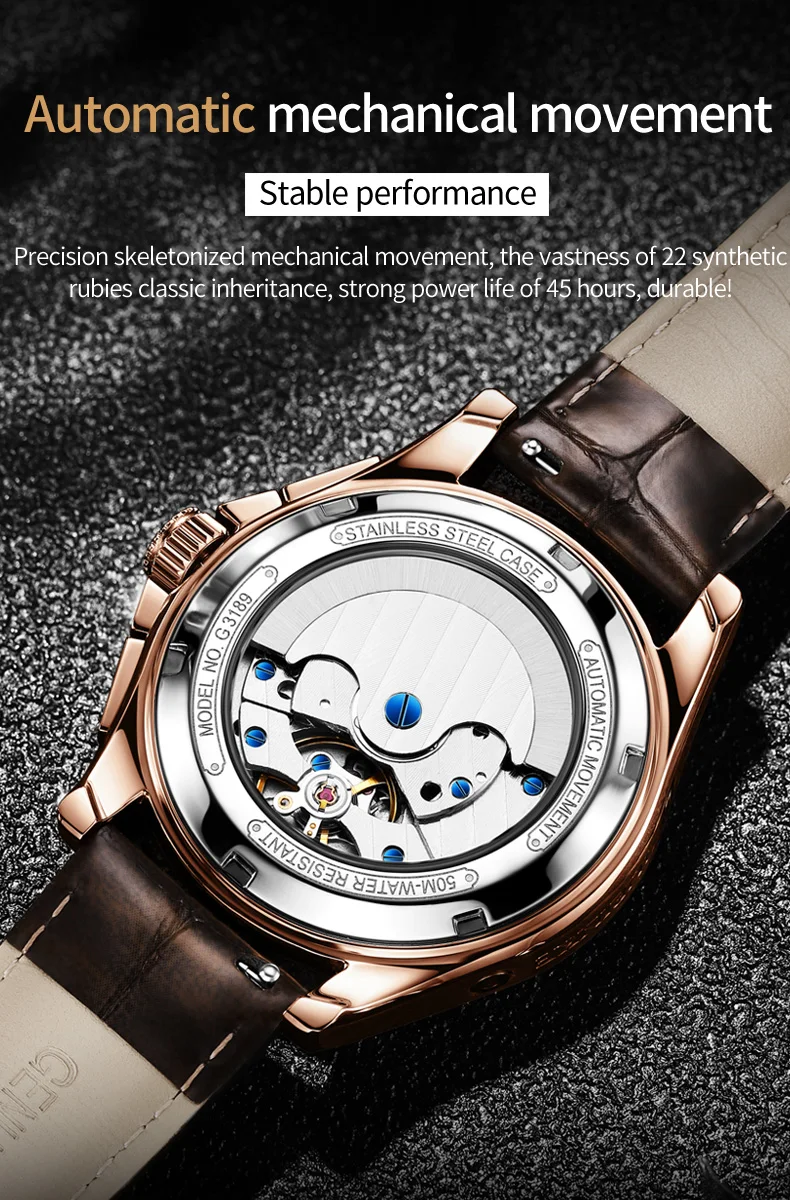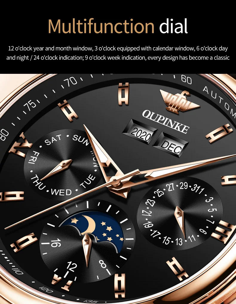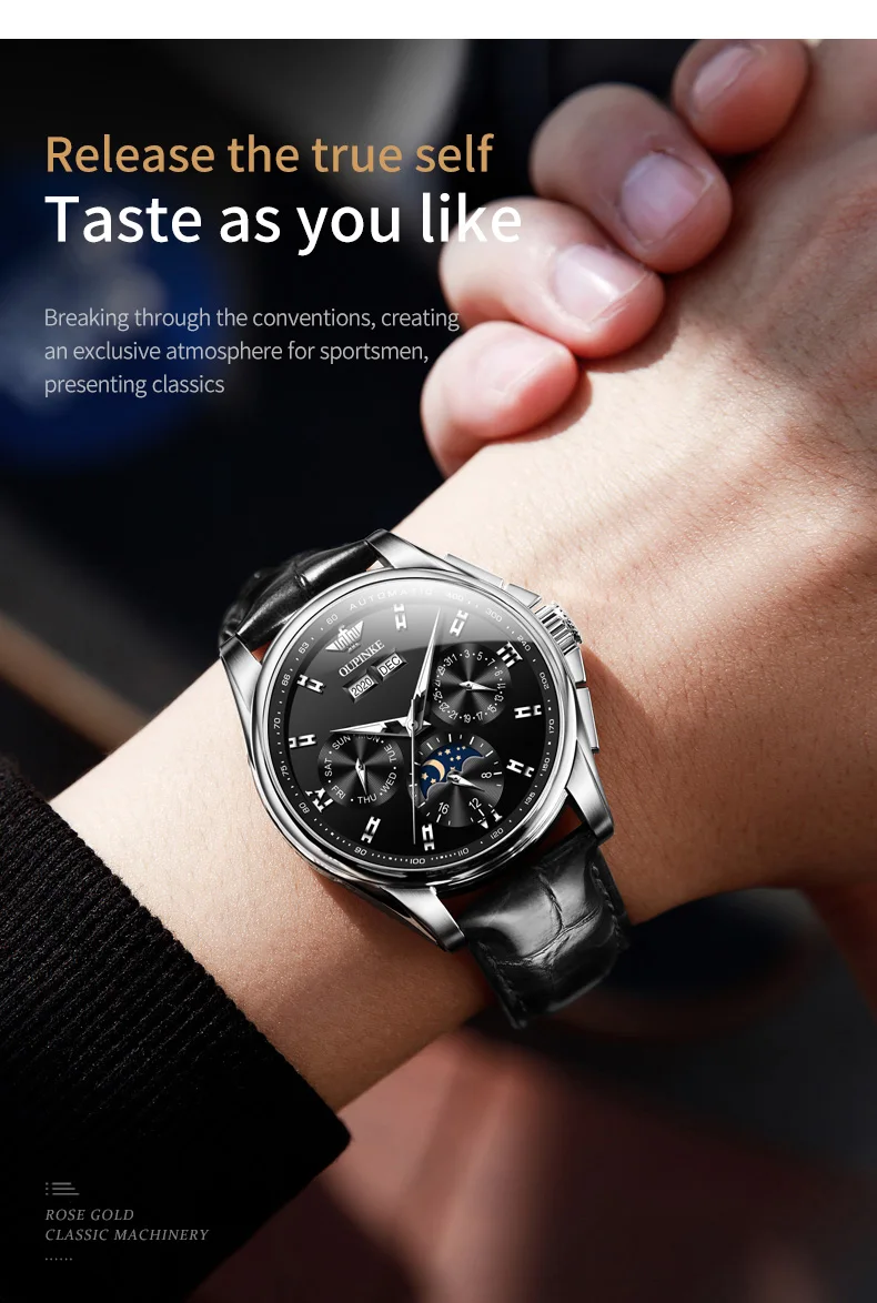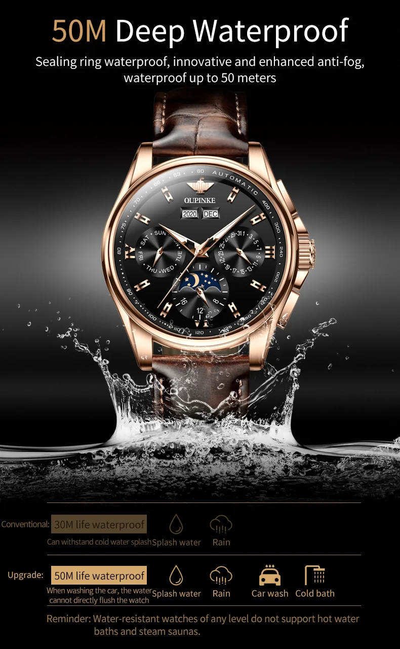 Top Brand OUPINKE Luxury Mechanical Watch Men Automatic Brown Leather Casual Waterproof Sport Moon Phase Wristwatch Reloj Hombre