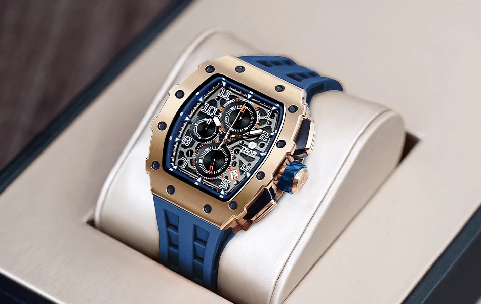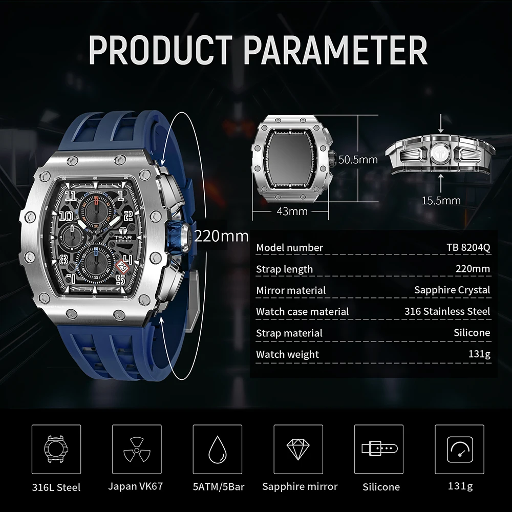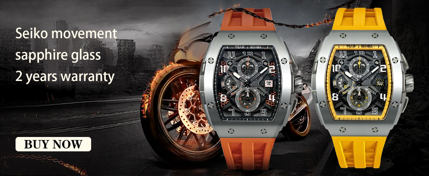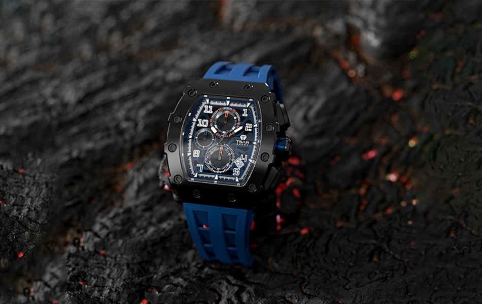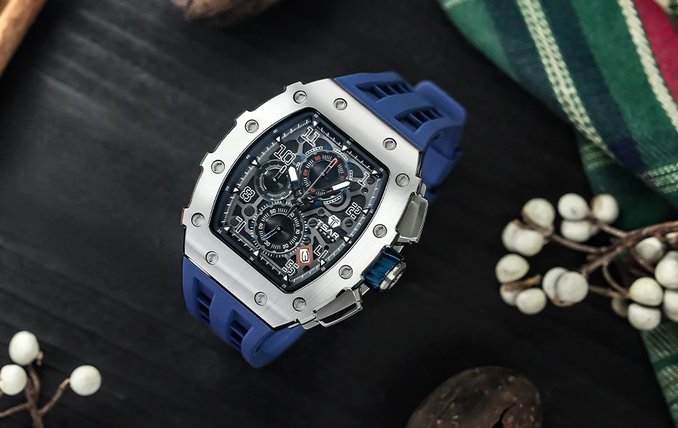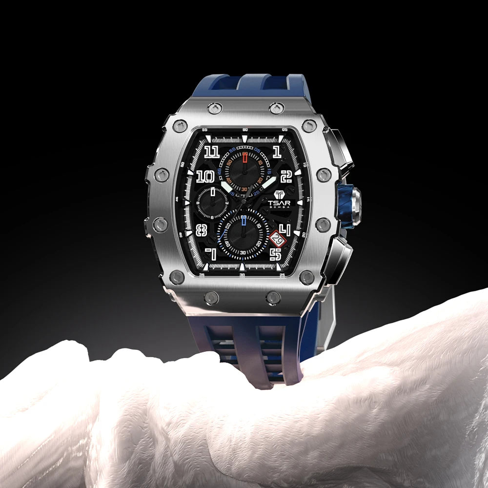 TSAR BOMBA Men Watches Luxury Brand Tonneau Clock 50M Waterproof Stainless Steel Sport Chronograph Wristwatch for Man