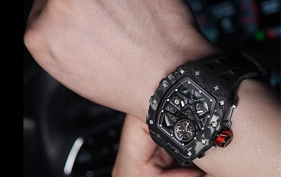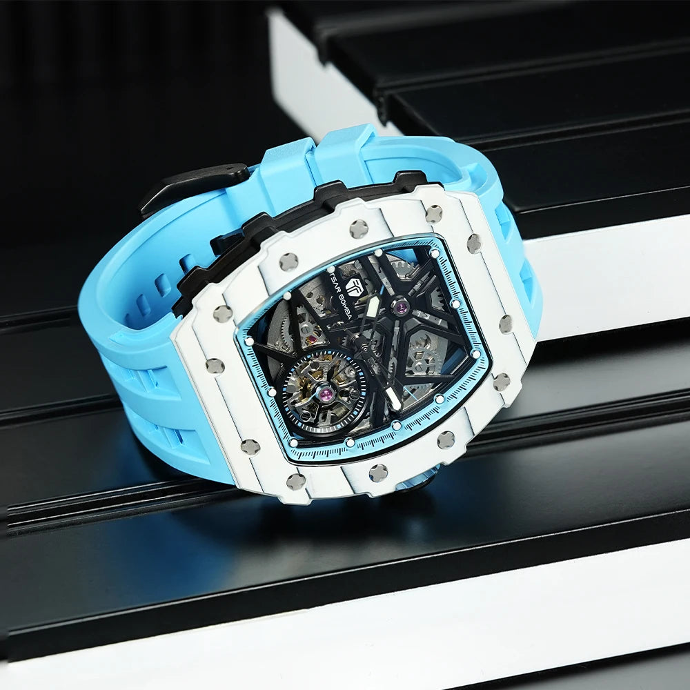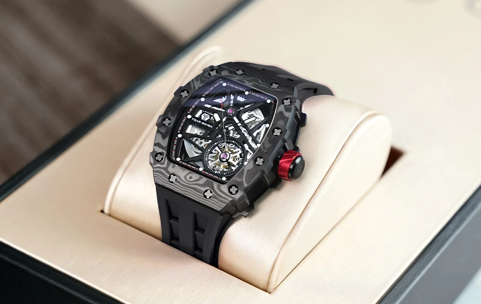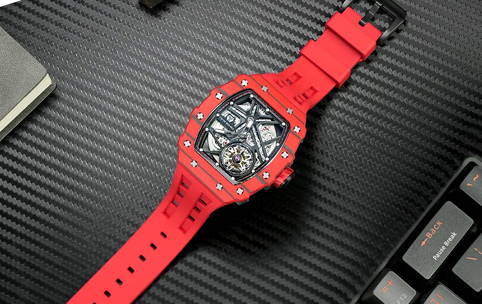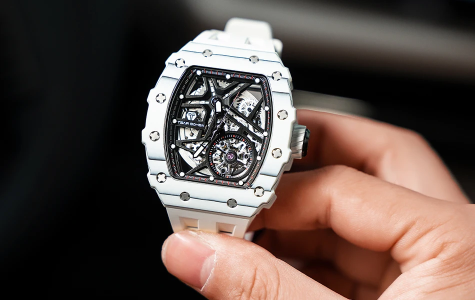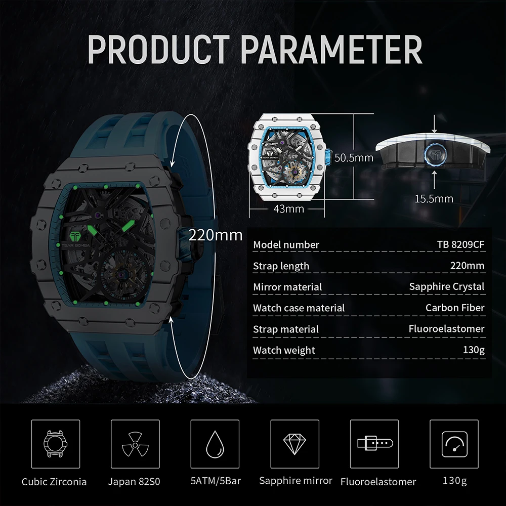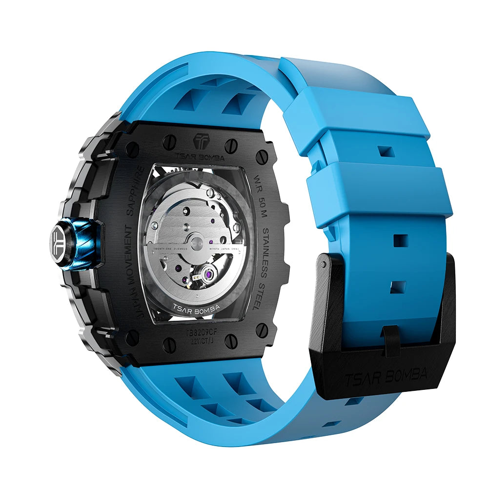 TSAR BOMBA Mens Automatic Watch Waterproof Luxury Mechanical Wristwatch Skeleton Clock Carbon Fiber Watch for Men