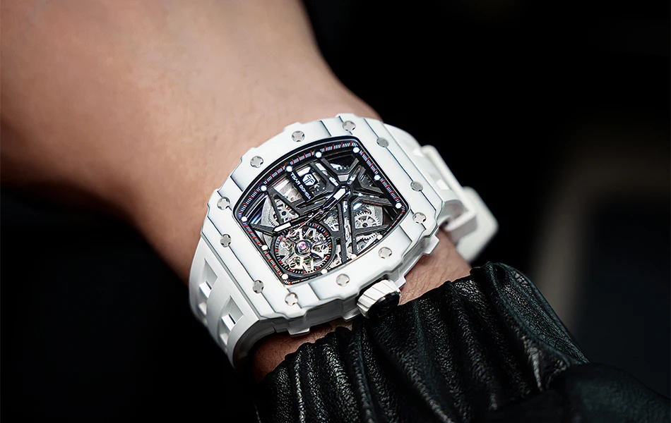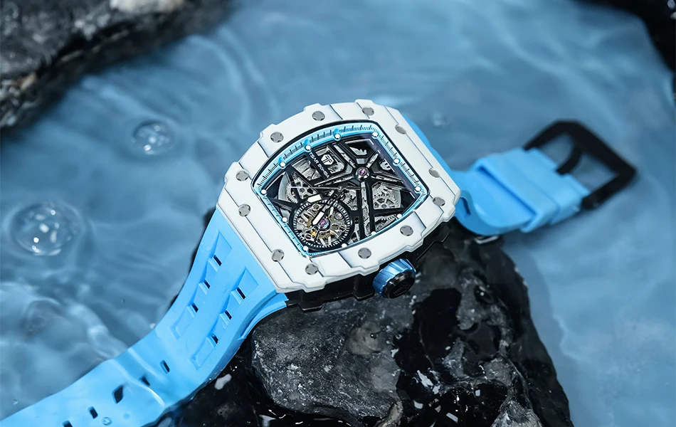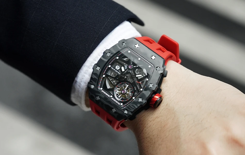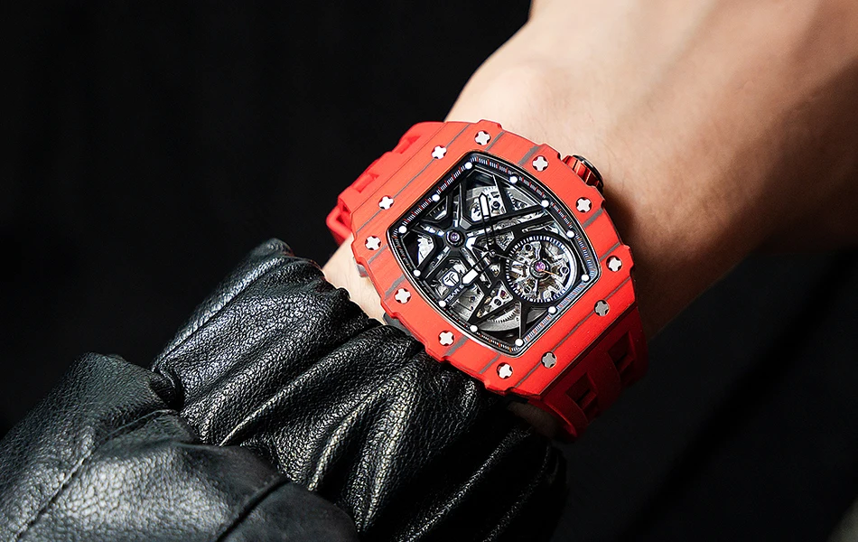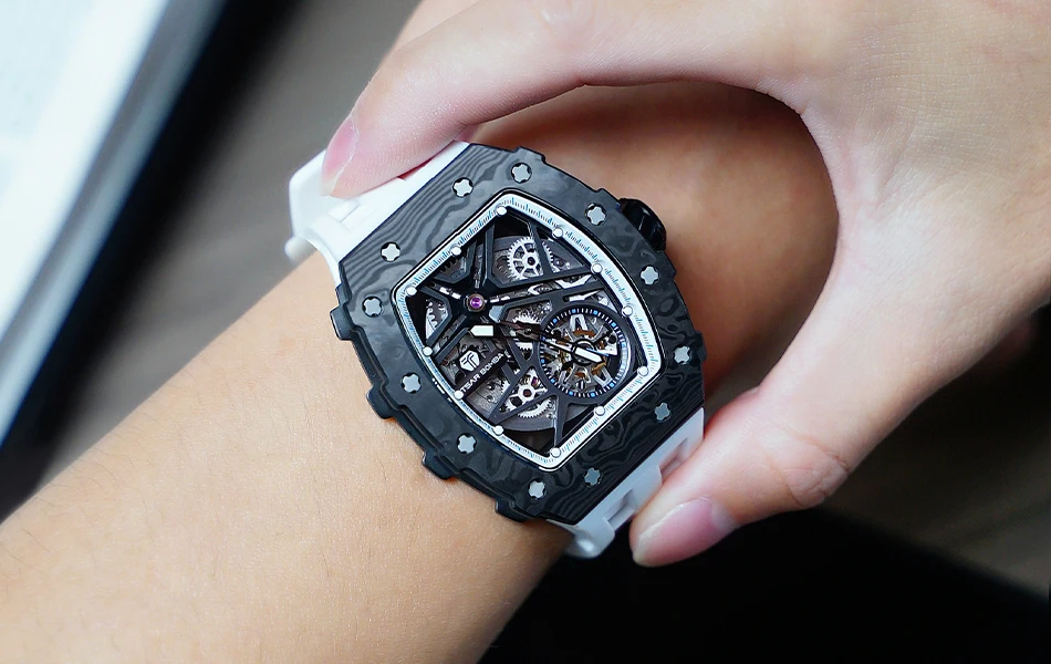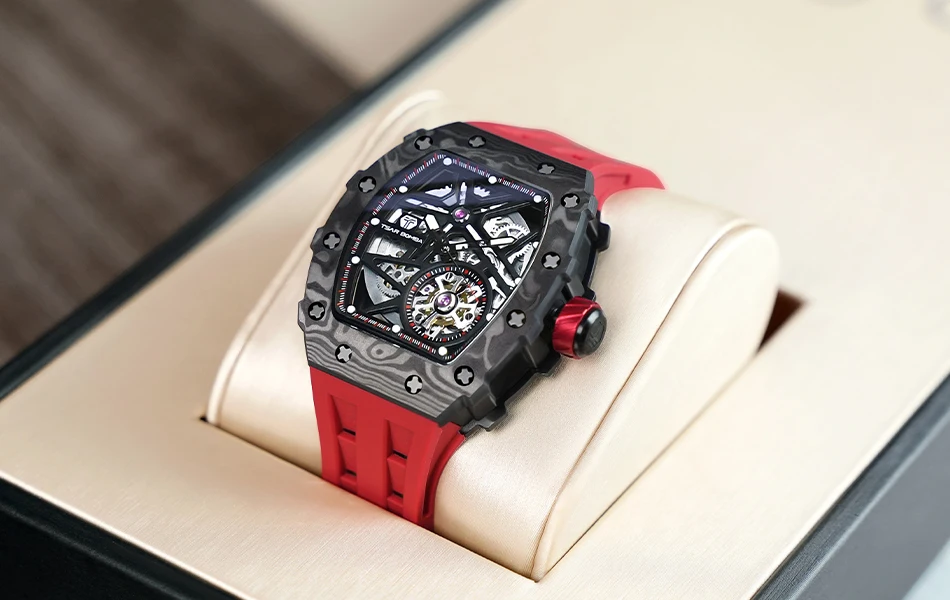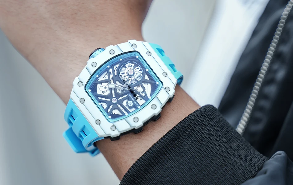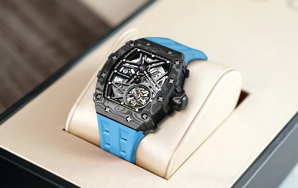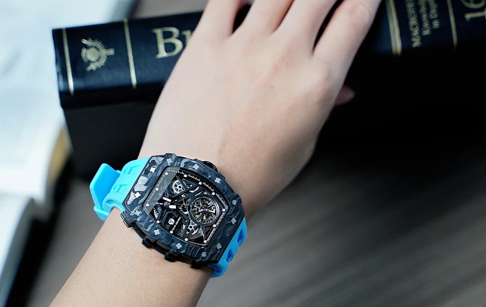 TSAR BOMBA Mens Automatic Watch Waterproof Luxury Mechanical Wristwatch Skeleton Clock Carbon Fiber Watch for Men