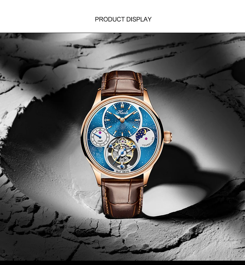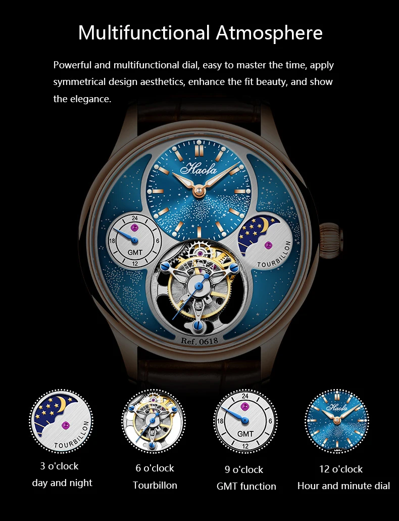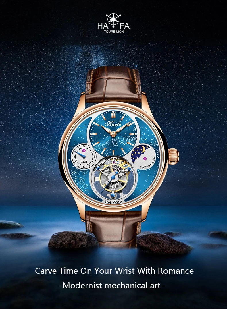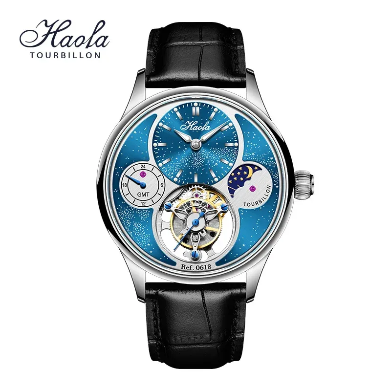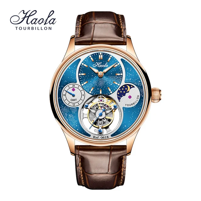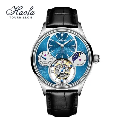 Haofa Luxury Skeleton Tourbillon Sapphire Watch for Men Manual Mechanical GMT Moonphase Wristwatches Casual Business 0618