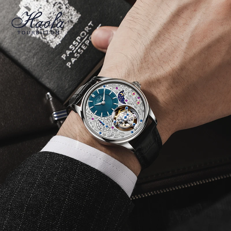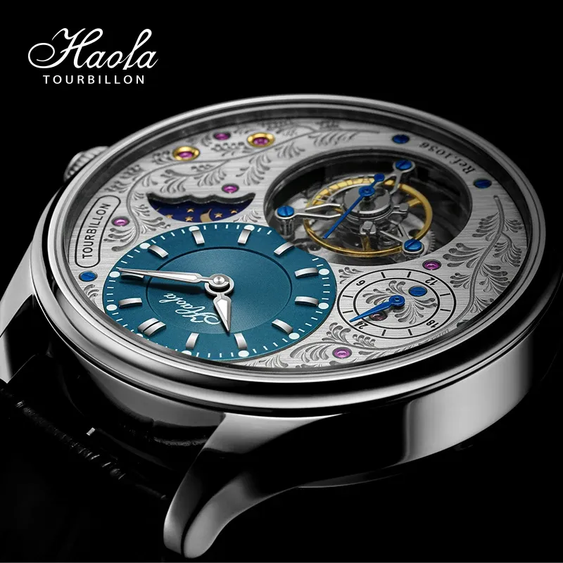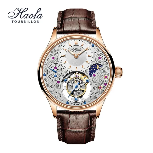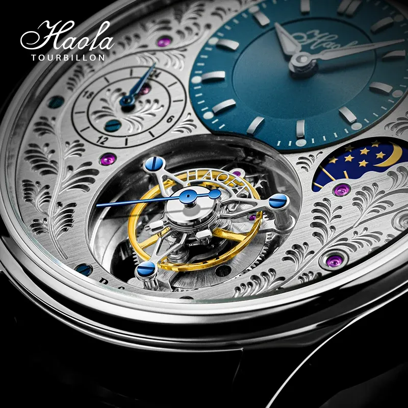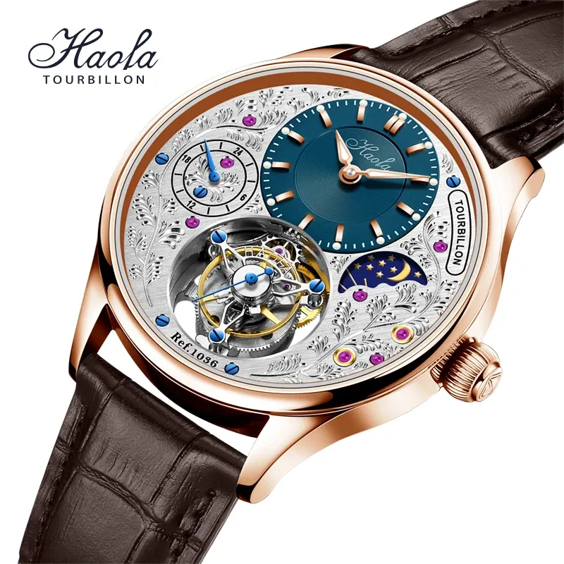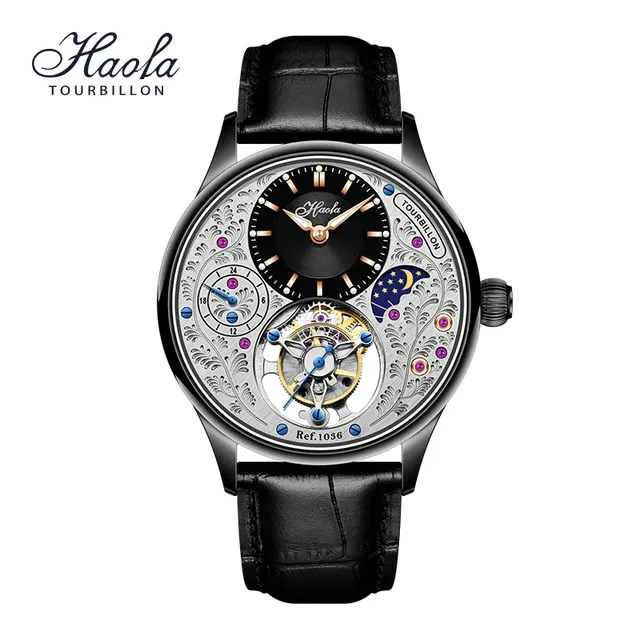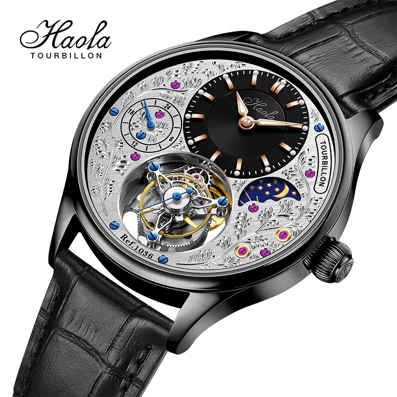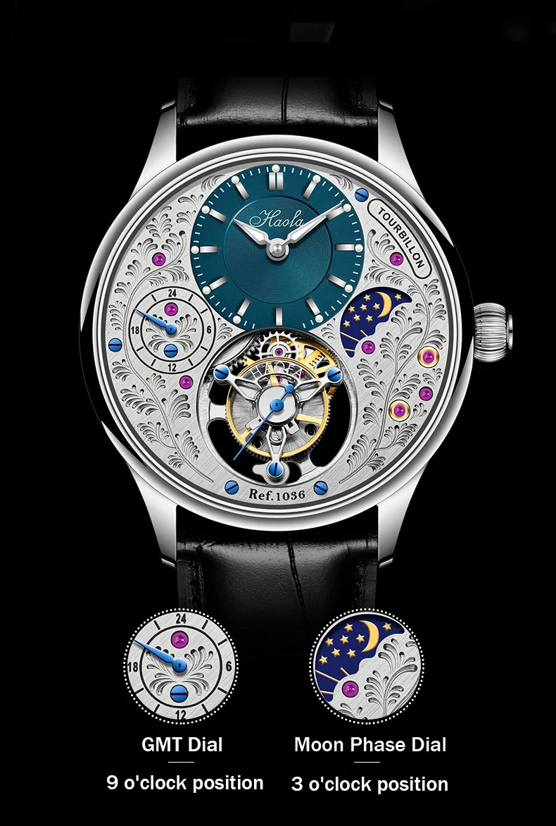 Haofa Manual Skeleton GMT Tourbillon Movement Watch for Men Rotating Sapphire Mechanical Watches Mens Day And Night Casual 1036