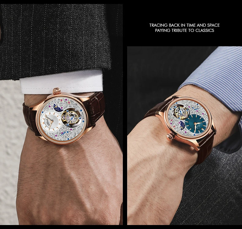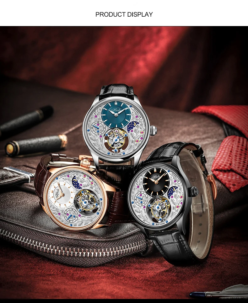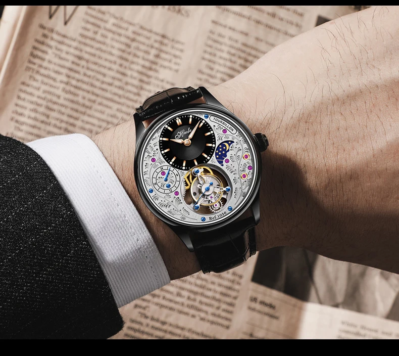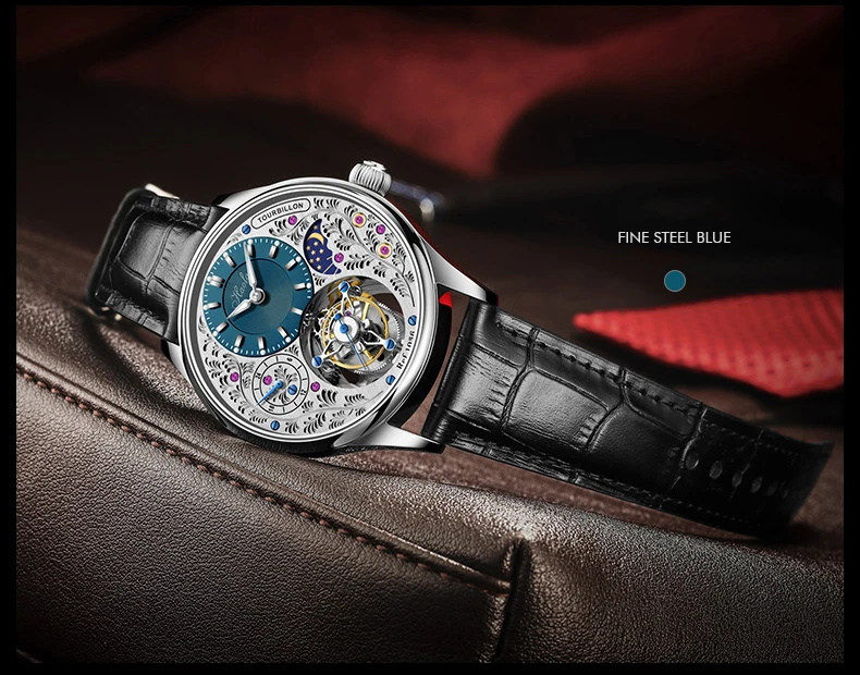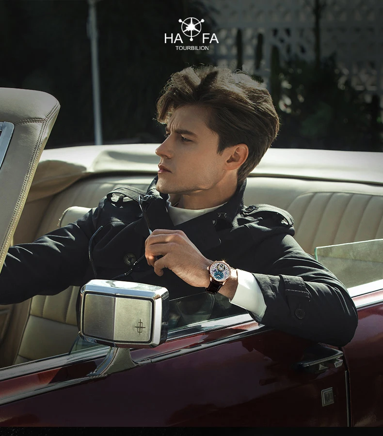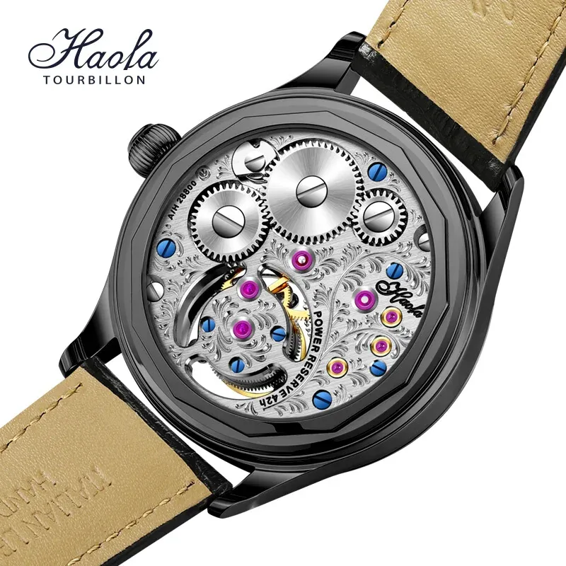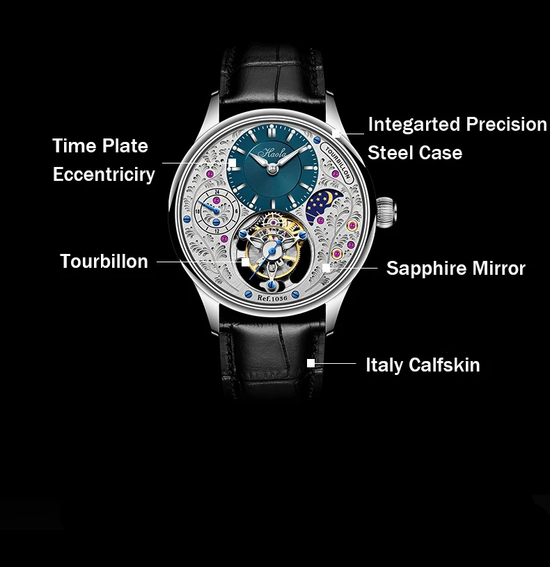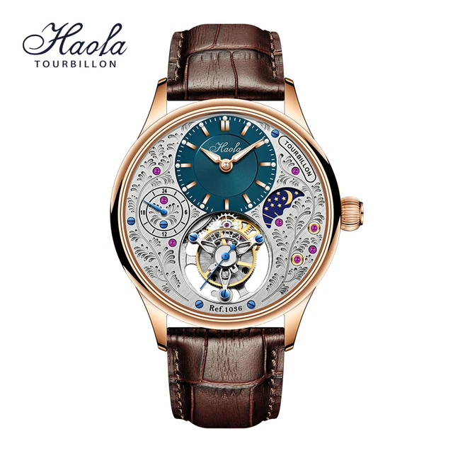 Haofa Manual Skeleton GMT Tourbillon Movement Watch for Men Rotating Sapphire Mechanical Watches Mens Day And Night Casual 1036